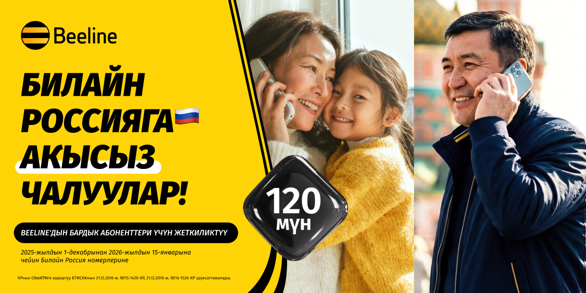 Beeline мамлекеттик уюлдук оператору аралыкка карабастан адамдарды бириктирет. Жаңы жылдын алдында компания бардык абоненттерине Россиядагы «Билайн» номерлерине чалуу үчүн 120 акысыз мүнөт белек кылат.
