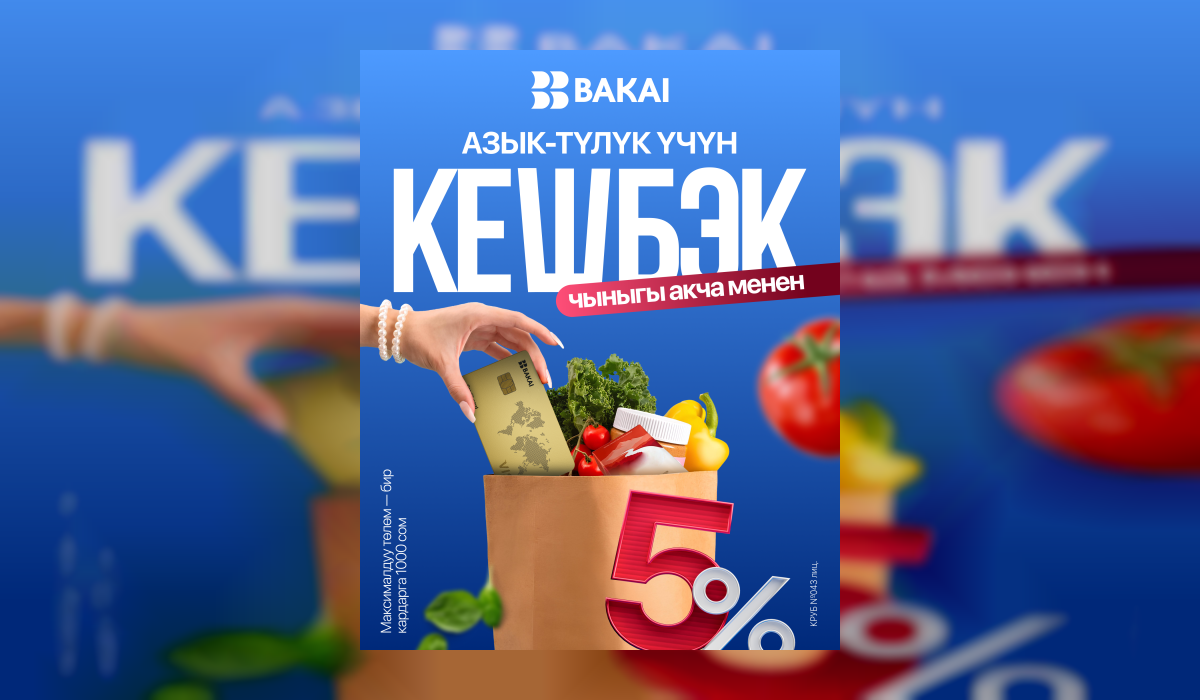 BAKAI өлкө боюнча супермаркеттерде жана азык-түлүк дүкөндөрүндө төлөмдөр үчүн 5% жогорулатылган кешбэктин ишке киргенин кабарлайт.
