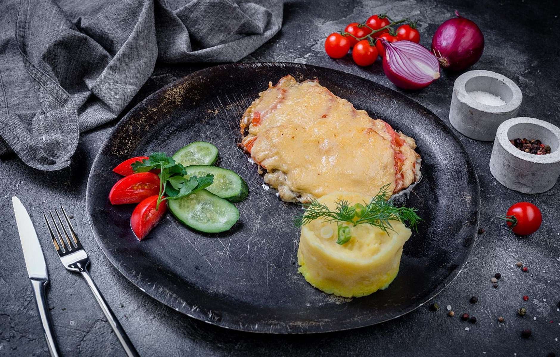 5. Электр табасына этти эки порция кылып бөлөбүз да, үстүнө куурулган картошка кесиминен 3-4тү коюп, анын үстүнө помидор кесиминен 3-4тү коёбуз да, бетине майонезден тегиз куябыз. Сүргүчтөн өткөрүлгөн сырды себелеп, электр мешине 180 градуста 10-15 мүнөт коюп бышырабыз.