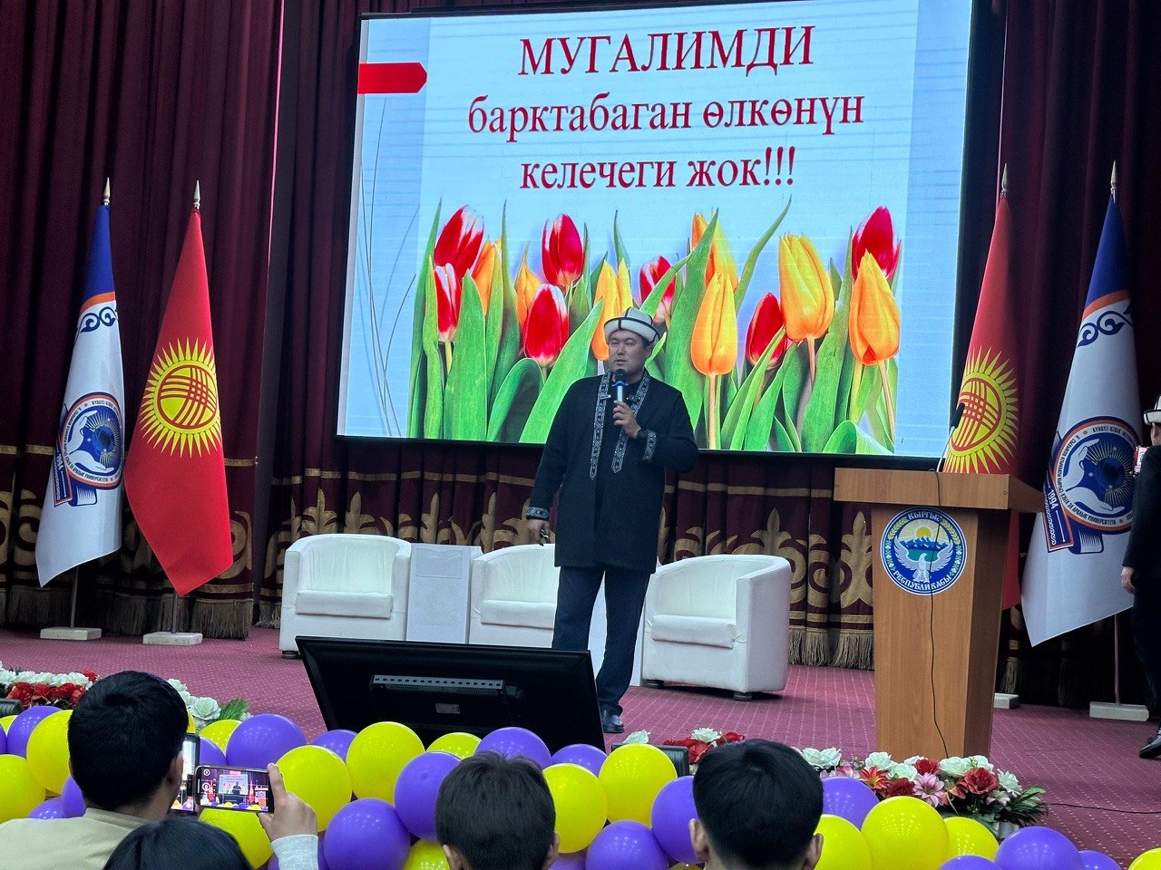 – Мугалимдер азыр ата-энелерге тиешелүү ишти кылып жатышат. "Балам, мектепке формаңды кийип бар, сабакта түз отур, жакшы оку, мугалимге урмат менен мамиле кыл" деген тарбияны үйдөн ата-эне бериши керек. Ата-энелерге кайрылгым келет: балдарыңызга көңүл буруңуз, үйдөн тарбия бериңиз. Мугалим менен окуучулардын ортосундагы айрым жагымсыз окуялар коомдо мугалимдин кадырын түшүрүп жатат. Кечээ мен 700 окуучу катышкан семинарда “Ким мугалим болот?” десем, 6-7 кыз, 1 бала гана кол көтөрдү. Бул – өкүнүчтүү. 700 баланын ичинен 10го жетпеген гана бала келечекте мугалим болгусу келет экен. Мугалимди барктабаган өлкөнүн келечеги жок.