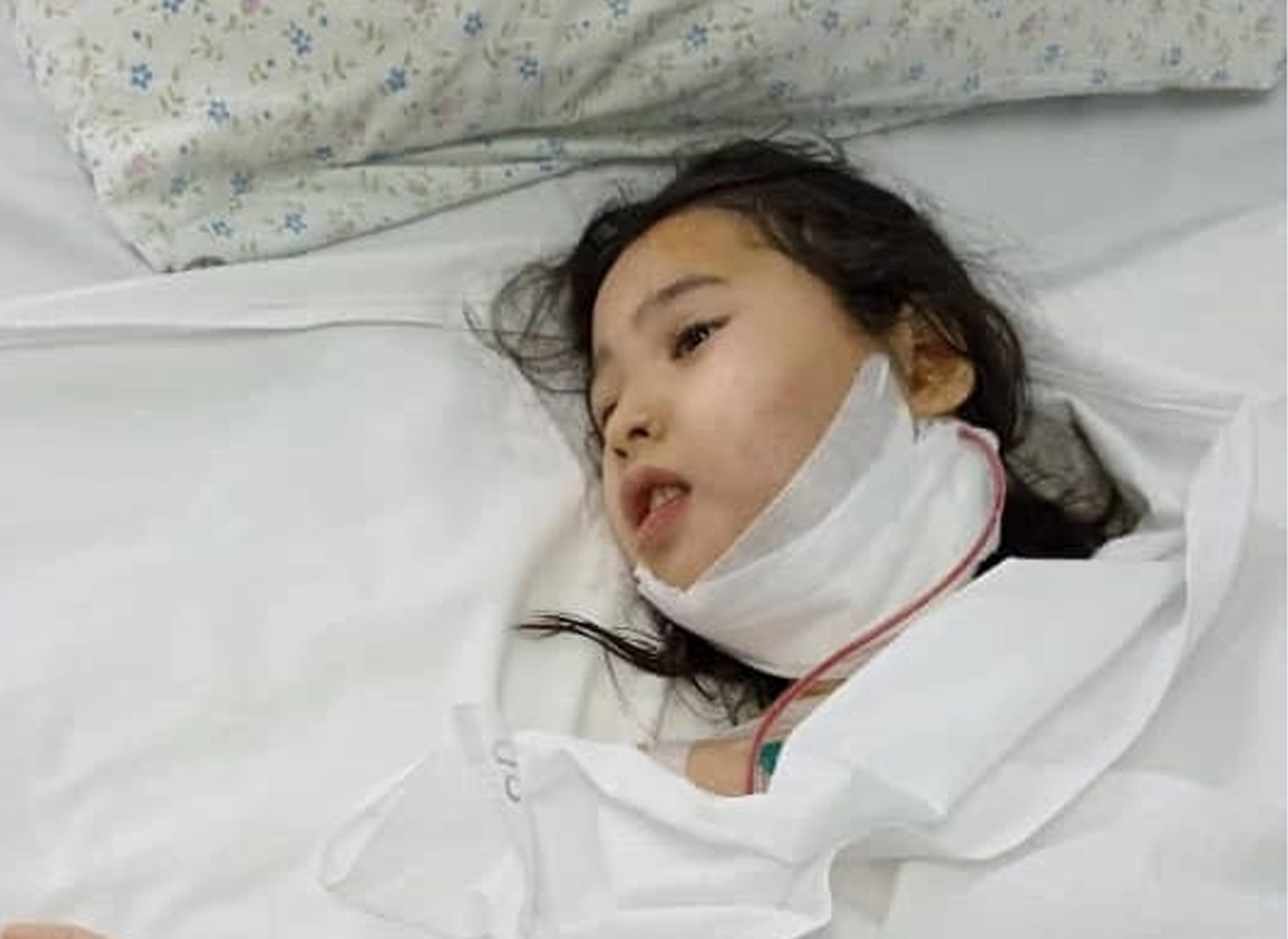 2021-жылдын жайында кызымдын бетинин кызарганы күчөп, тамак жегенде жаагы ооруй турган болду. Декабрда Бишкектеги Эне жана баланы коргоо улуттук борборуна кайра алып бардык. Врач “ооруган жаагынын ич жагында киста бар” деди. Кызыбыздын диагнозун айтсак, сөзүбүздү укпады. Операцияга алып кирип кетишти да, бат эле чыгып “ооруган жерин ачсак кан агып, токтобой койду. Эптеп токтотуп, кайра жаап салдык” дешти.