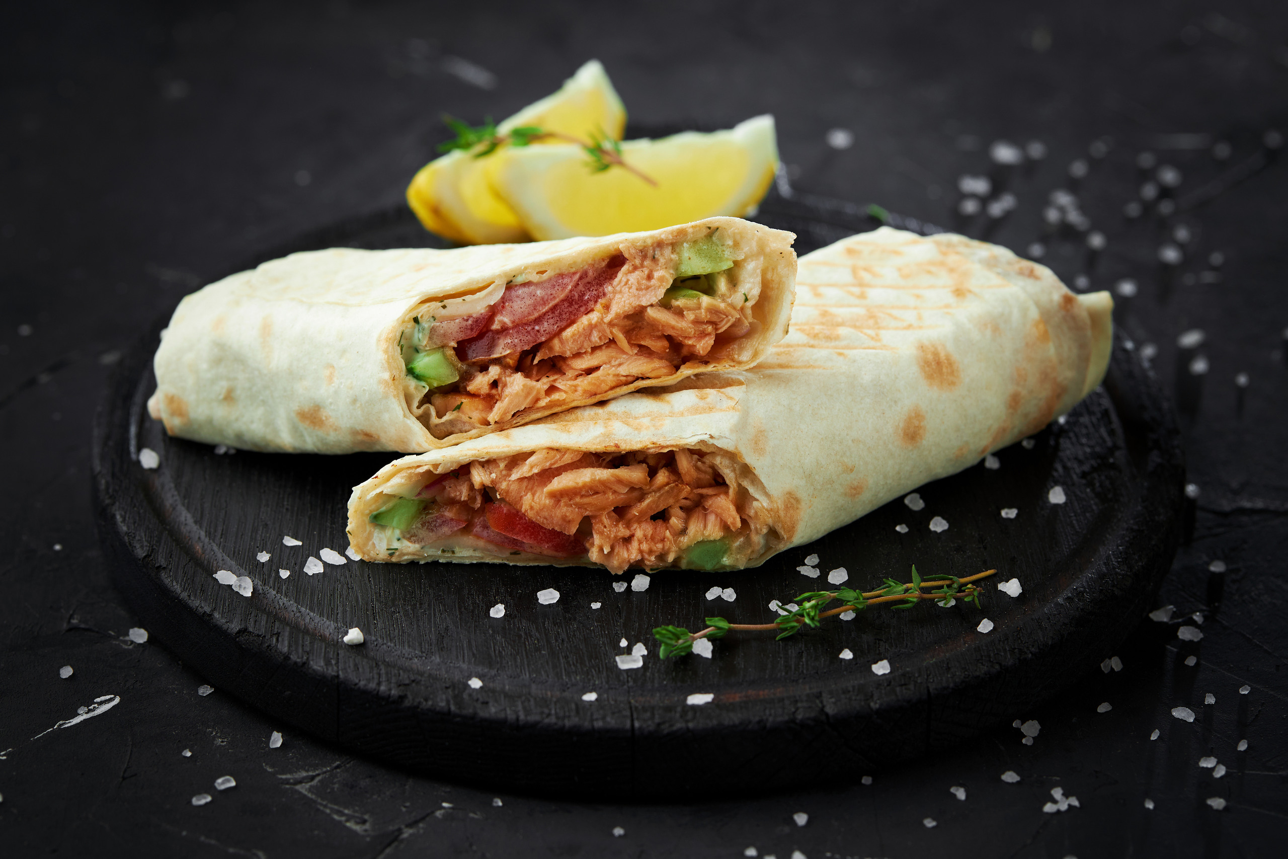 2. Лавашка быштактуу сырды сүйкөп, салат жалбырагын коёбуз. Үстүнө тоок этин жана помидор кесимдерин коюп оройбуз. Ток кармаган шаурмабыз даяр!