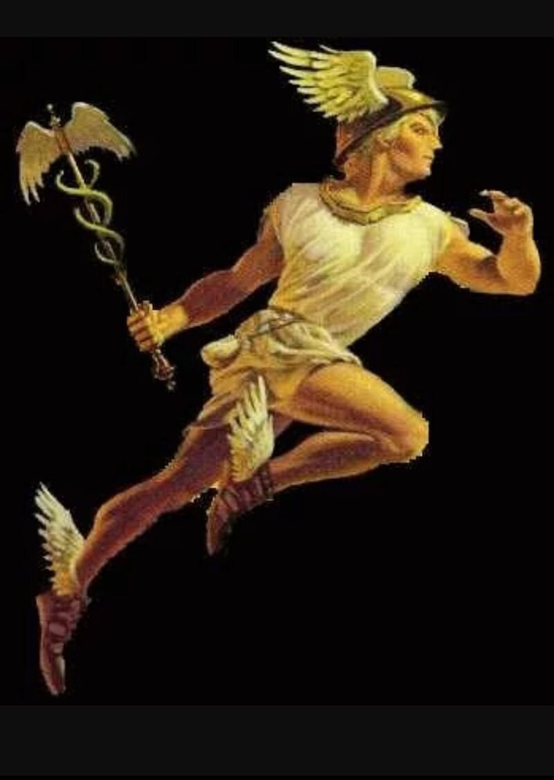 Юпитер баласын өзүнүн чабарманы кылып шайлайт. Ал атасынан учуучу канаттары бар сандалия жана баш кийим, оролгон 2 жыланы бар сыйкырлуу таякты алат. Атасынын кабарларын ошентип керектүү жерге бат жеткирип турат. Ал барган жерлеринде тынчтыкты орнотуп, жолдо жүргөндөрдү кырсыктардан сактап кала баштайт. Адамдар узак сапарга чыгарда Меркурийге курмандык чалып, бизди сакта деп жалына турган.