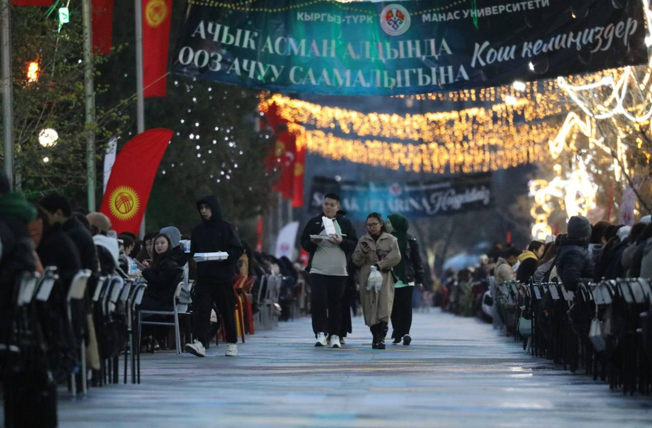 Акыркы 3 жылдан бери уюштурулган ооз ачуу кечесине коомдун бардык катмарынан жаш-кары дебей бир дасторконго чогулду. “Манас” университетининде он бир айдын султаны Орозо айынын шаңы менен дуба окулуп, ооз ачылды. Бул өзгөчө иш-чара жүрөктөрдү бири-бирине жакындатты.