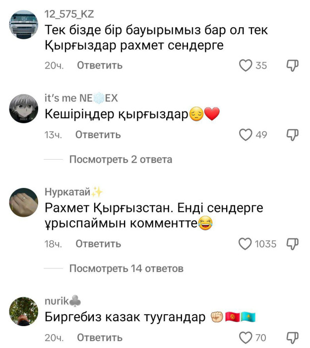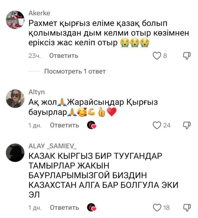 "Кыргыз элиме рахмат, көзүмө жаш келип турат" деп ыраазычылыктарын билдиришүүдө казакстандыктар.