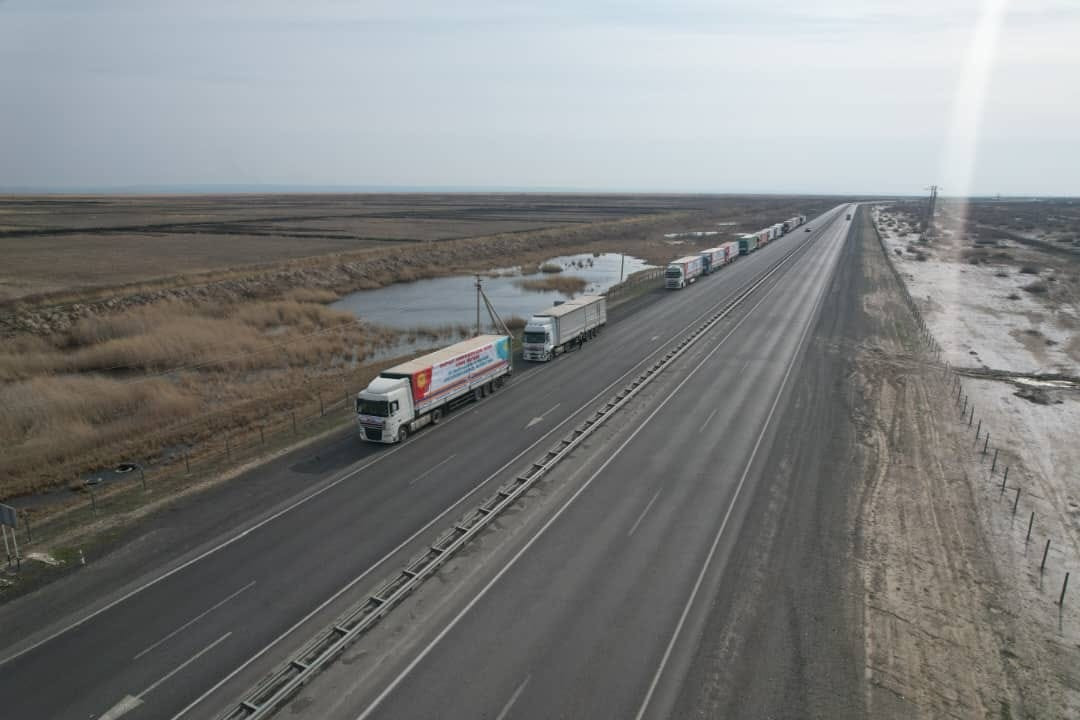 Ушул тапта 16 жүк ташуучу унаага жүктөлгөн 270 тонна гуманитардык жүк Казакстанга жеткирилген. Гуманитардык жүктүн арасында азык-түлүк, кийим-кече, тез даярдалуучу кесме, таттуу азыктар, электр жылыткычтары, матрац жана чатырлар бар.