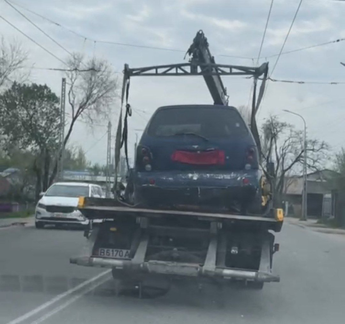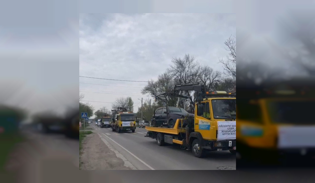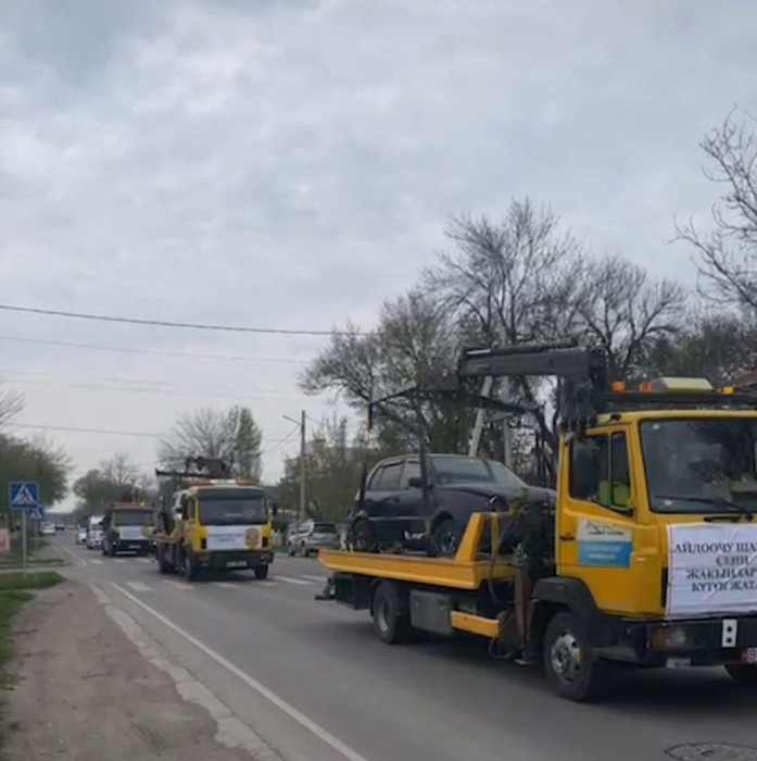 Бүгүн, 13-апрелде Бишкек шаарында жол кырсыгынан талкаланган унааларды эвакуаторлор жүктөп алып, шаарды кыдырып жүрөт.