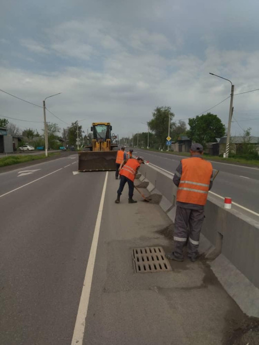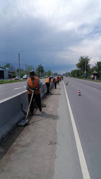 - №28 Жол тейлөө ишканасынын кызматкерлери Бишкек-Кара-Балта унаа жолундагы тосмолордун түбүн тазалап жатышат.