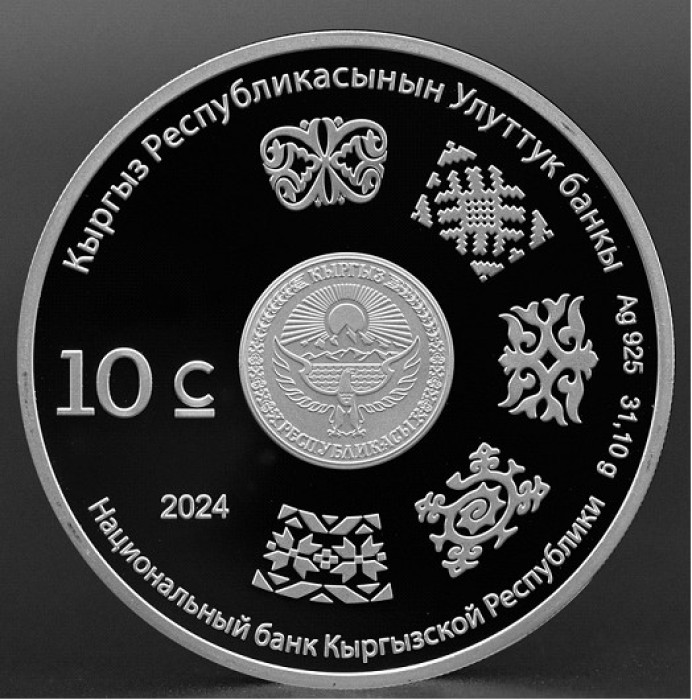 "Коллекциялык монетанын алдыңкы бетинде ЕАЭБдин расмий эмблемасы, эмблеманы тегерете ЕАЭБге мүчө мамлекеттердин желектери, ошондой эле өнүгүү динамикасын билдирген элементтер чагылдырылган. Монетанын сол жагында ЕАЭБдин юбилейлик датасы — "10 жыл" деген жазуу бар. Жээгинде "Евразия экономикалык бирлиги" деген жазуу түшүрүлгөн. Монетанын арткы бетинин так ортосунда Кыргызстандын герби жайгашкан, ал эми оң жагында ЕАЭБге мүчө мамлекеттердин улуттук орнаменттери, ошондой эле металлдын сапат белгиси (Ag 925) жана салмагы (31,10 g) көрсөтүлгөн. Жогору жана төмөн жагында "Кыргыз Республикасынын Улуттук банкы" деген жазуу, ал эми сол жагында монетанын номиналы (10), сомдун графикалык белгиси (С) жана чыгарылган жылы (2024) чагылдырылды", - деп айтылат билдирүүдө.