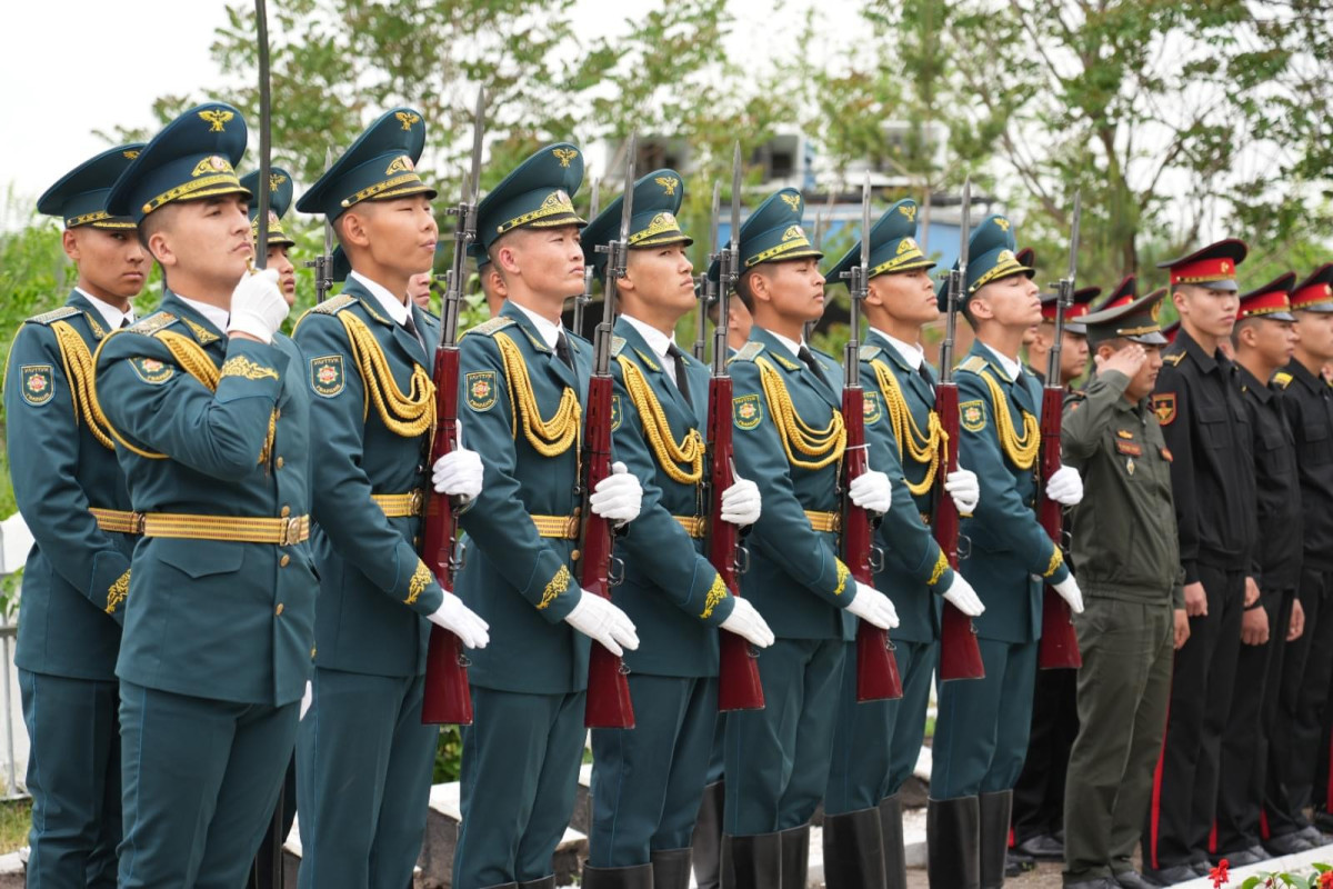Ага ылайык, иш-чаранын катышуучулары курман болгон жоокерлерди эскеришип, жоокерлердин эстелигине гүл коюшту.