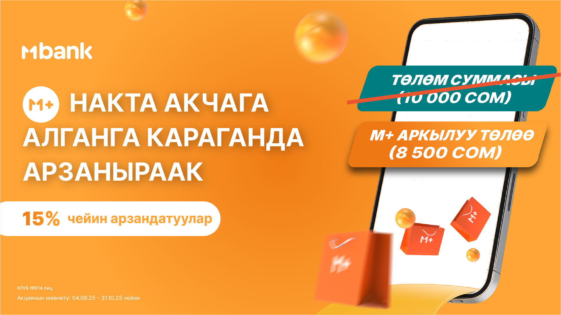 MBANK 1-августтан 31-октябрга чейин “M+ менен арзаныраак” аттуу акцияны баштады. Бул акция сатып алууларга болгон мамилеңизди өзгөртөт! Эми сиз 15% чейин үнөмдөп, сатып алууларды пайызсыз жана 12 айга чейин бөлүп төлөө менен сатып ала аласыз. Накталай төлөгөнгө караганда арзаныраак!