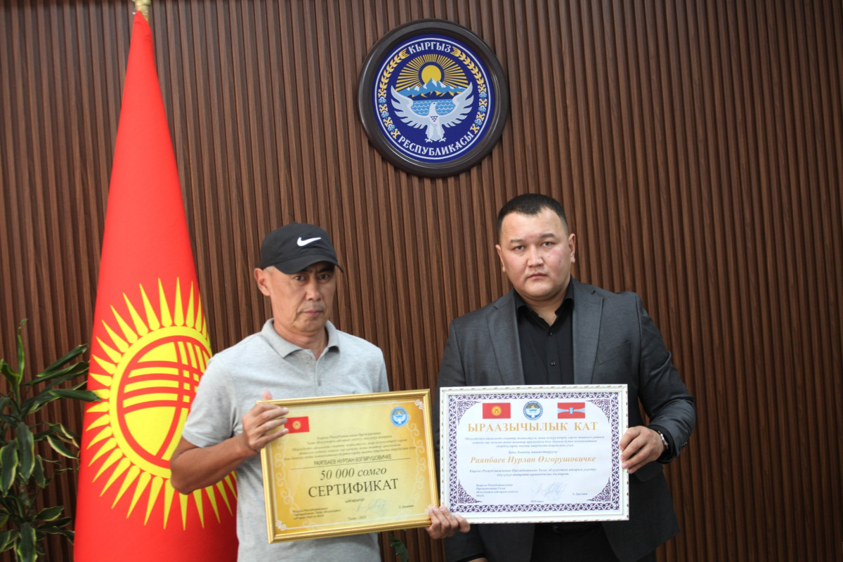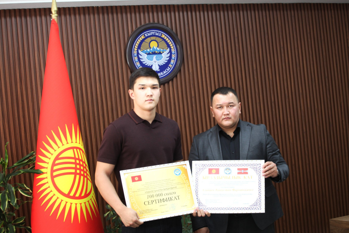 Ошондой эле, анын машыктыруучусу Нурлан Раяпбаевге Ыраазычылык кат жана 50 000 сомдук сертификат ыйгарылды.