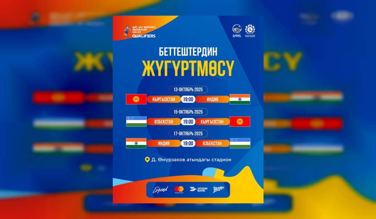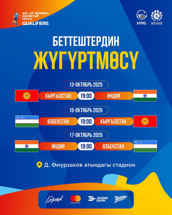 13–17-октябрь күндөрү Бишкек шаарында өлкөнүн U-17 кыздар курама командасынын катышуусунда 2026-жылкы Азия Кубогунун тандап алуу оюндары өтөт. Бул тууралуу Кыргыз футбол бримдигинен билдирди.