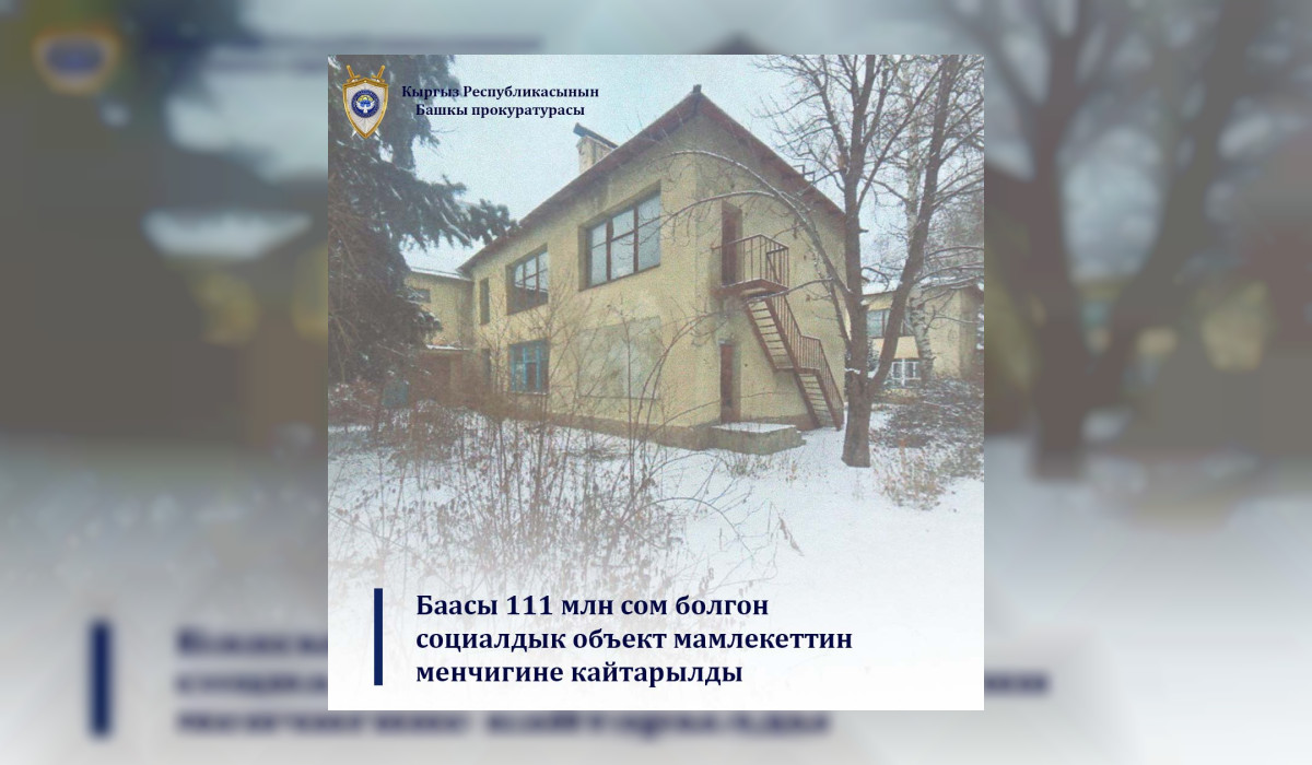 Прокурордук чара көрүү актысынын алкагында наркы 111 миллион 93 миң сомго бааланган бала бакчанын имараты жана жер тилкеси мыйзамдын талаптарына ылайык, мамлекеттин менчигине кайтарылды.