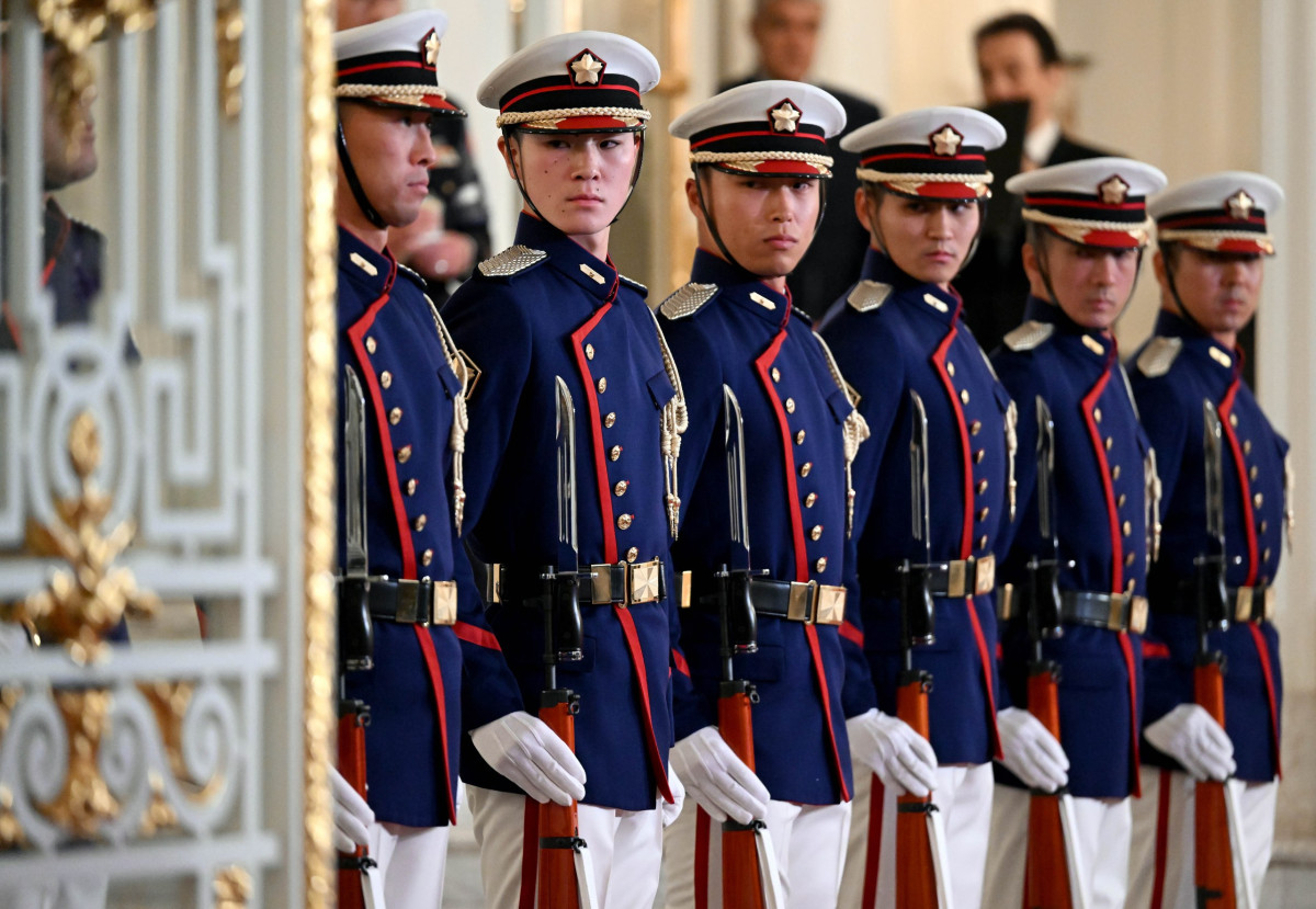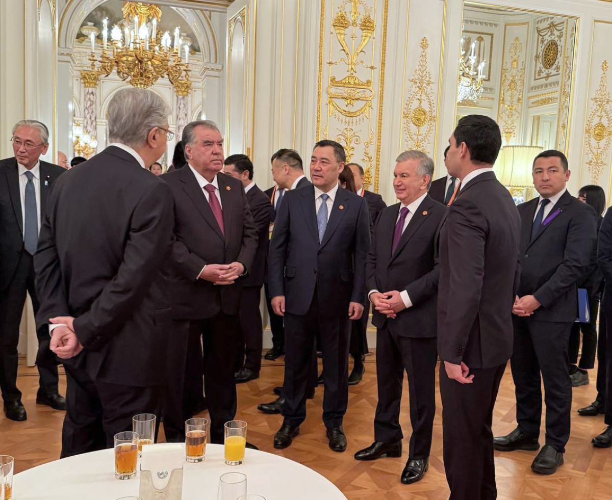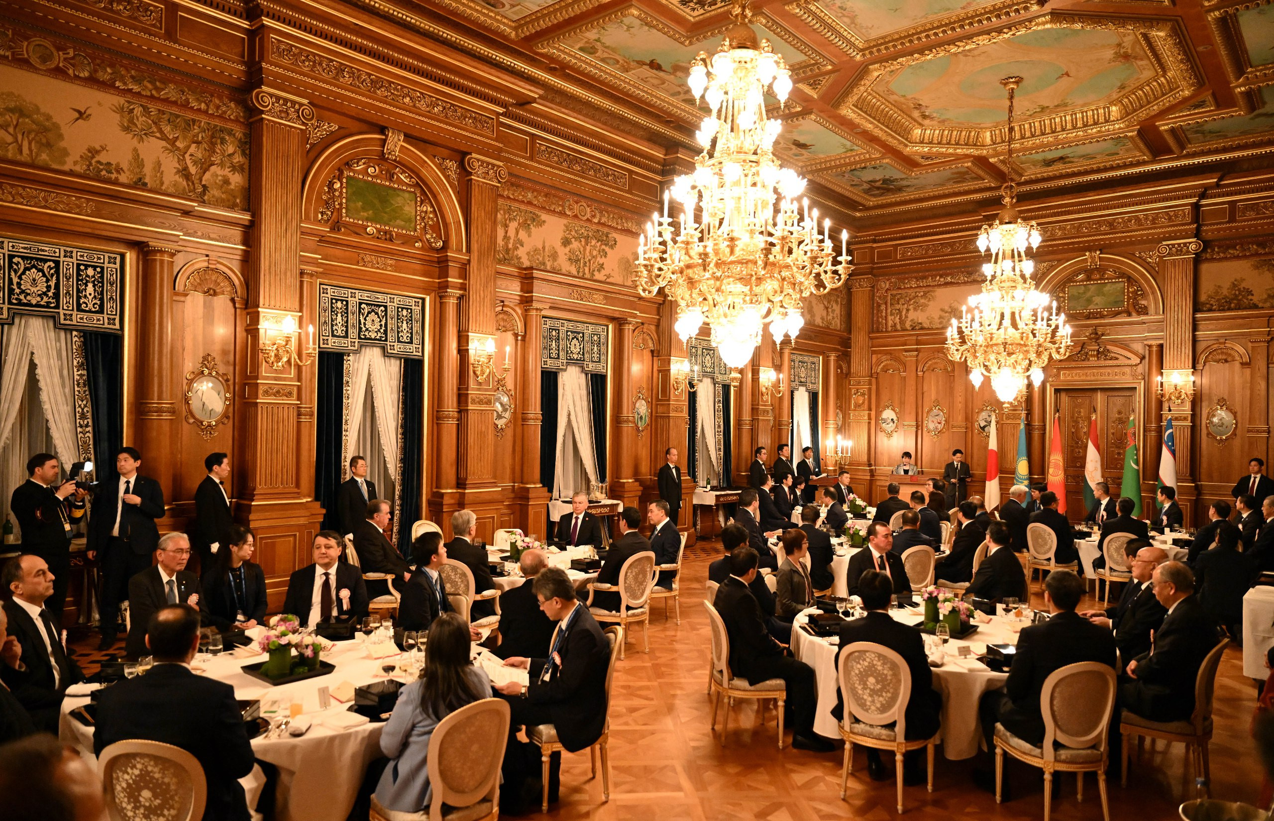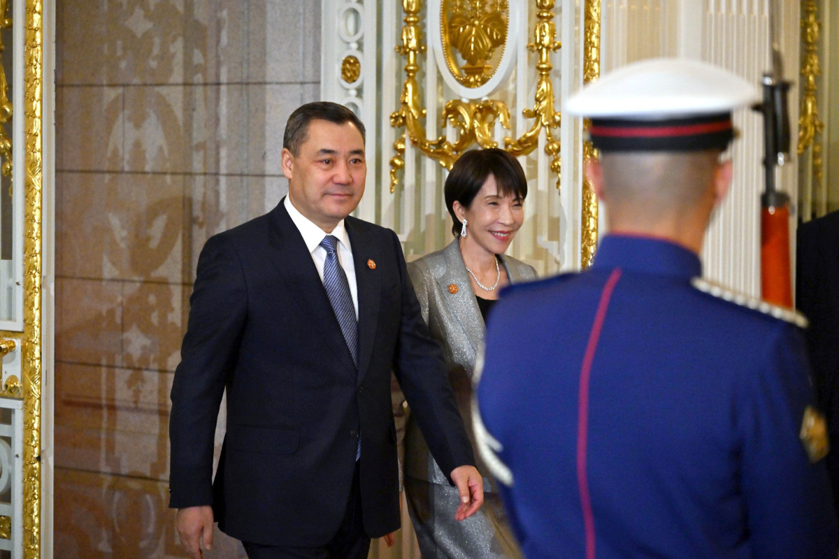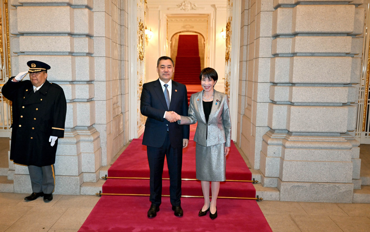 Андан соң президент Садыр Жапаров менен Япониянын премьер-министри Санаэ Такаити ардактуу кароол ротасынын жанынан кызыл килем үстүнөн өтүшүп, биргелешип сүрөткө түшкөндөн кийин Борбордук Азия өлкөлөрүнүн лидерлеринин урматына уюштурулган кечки сый тамакка катышуу үчүн залга өтүштү.