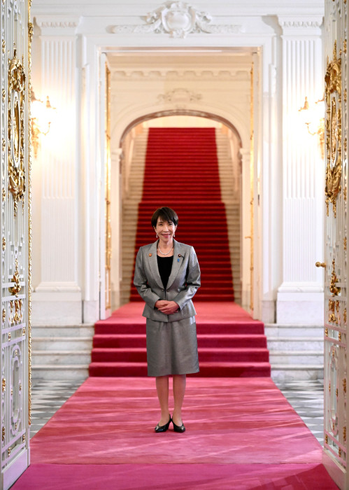 Мамлекет башчысынын басма сөз кызматы билдиргендей, өлкө башчысын Япониянын премьер-министри Санаэ Такаити тосуп алды.