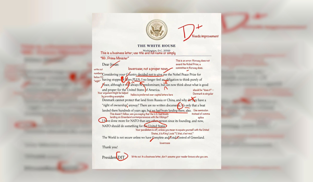 Анда каттагы каталар кызыл чийимдер менен оңдолуп, D+ деген баа коюлганын көрүүгө болот. D+ "канааттандырарлык" деген баа. Оңдолгон катта грамматикалык каталардан тышкары, ишкердик кат алышуунун негизги эрежелери бузулганы көрсөтүлгөн. Трамп катты "Урматтуу премьер-министр мырза" дегендин ордуна "Урматтуу Йонас" деген сөз менен баштаган.