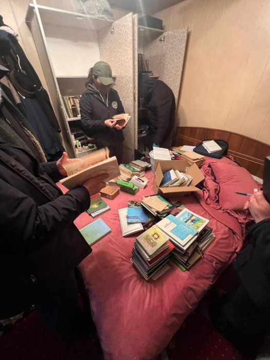 Атайын кызматтын маалыматы боюнча, тинтүүдө 217 далил буюм табылган. Алардын ичинде, 75 даана китеп, 14 даана уюлдук телефон, 18 даана дептер, 86 даана DVD диск, 4 даана планшет, 1 ноутбук, 2 симкарта, 14 Орусиянын жаранынын паспорту, 1 мөөр, 1 видеокассета жана 1 банк картасы.