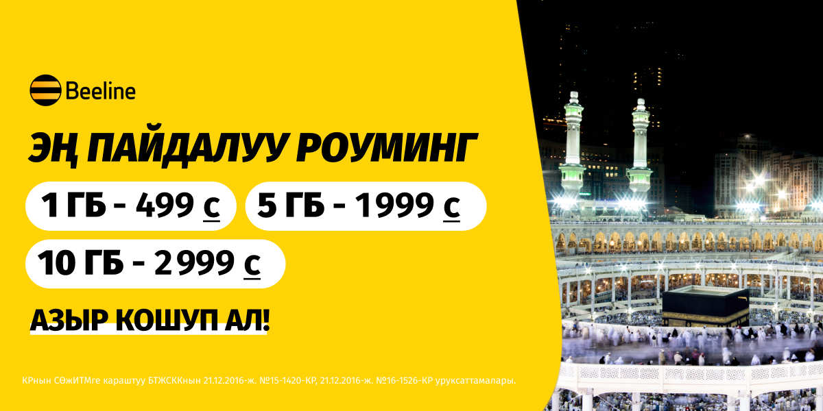 Жақындарыңызга чалып, маанилүү учурларды бөлүшүү же керектүү жерге маршрут түзүү мүмкүнчүлүгү үйдөн алыс жерде өзүңүздү ишенимдүү сезүүгө жардам берет. Сиз негизги нерсеге көңүл буруп, байланыш үчүн кабатыр болбошуңуз үчүн, Beeline улуттук мобилдик оператору роумингде пайдалуу жана ыңгайлуу интернет топтомдорун сунуштайт:
