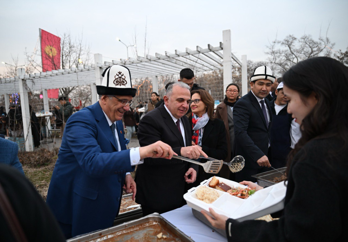 Андан соң алар Кыргызстандын Илим, жогорку билим берүү жана инновациялар министри Гүлзат Исаматова жана Түркиянын Бишкектеги элчиси Мекин Мустафа Кемал Өкем менен бирге тамак таратуу бөлүгүнө барып, катышуучулардын табактарына өз колдору менен тамак салып беришти.