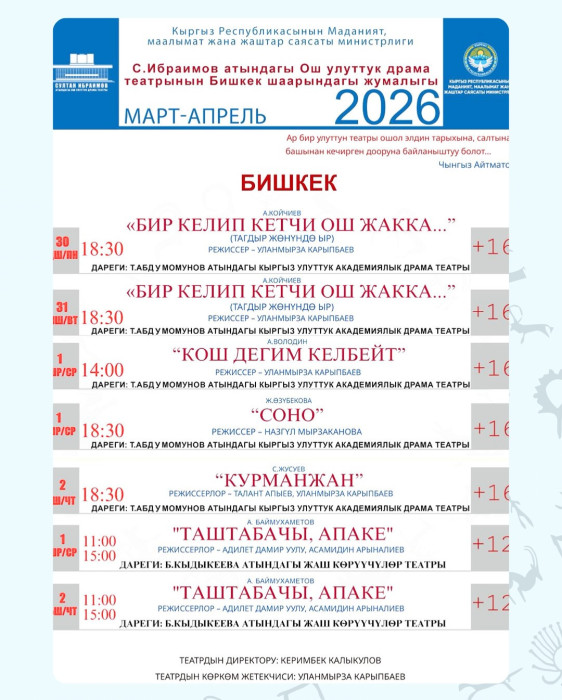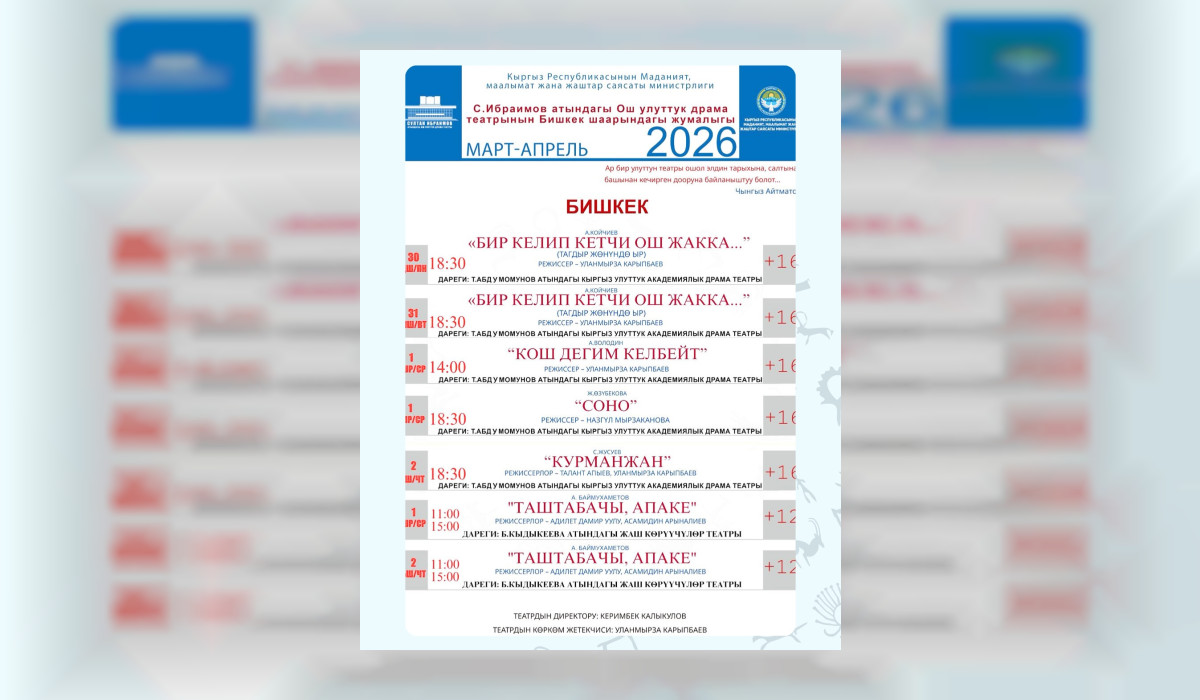 Бишкектеги Токтоболот Абдумомунов атындагы Кыргыз улуттук академиялык драма театры жана Бакен Кыдыкеева атындагы Кыргыз улуттук академиялык драма театрынын сахнасында Ош улуттук драма театры өзүнүн мыкты спектаклдерин тартуулайт. Бул тууралуу Маданият министрлиги билдирди.