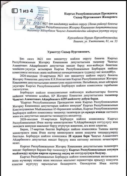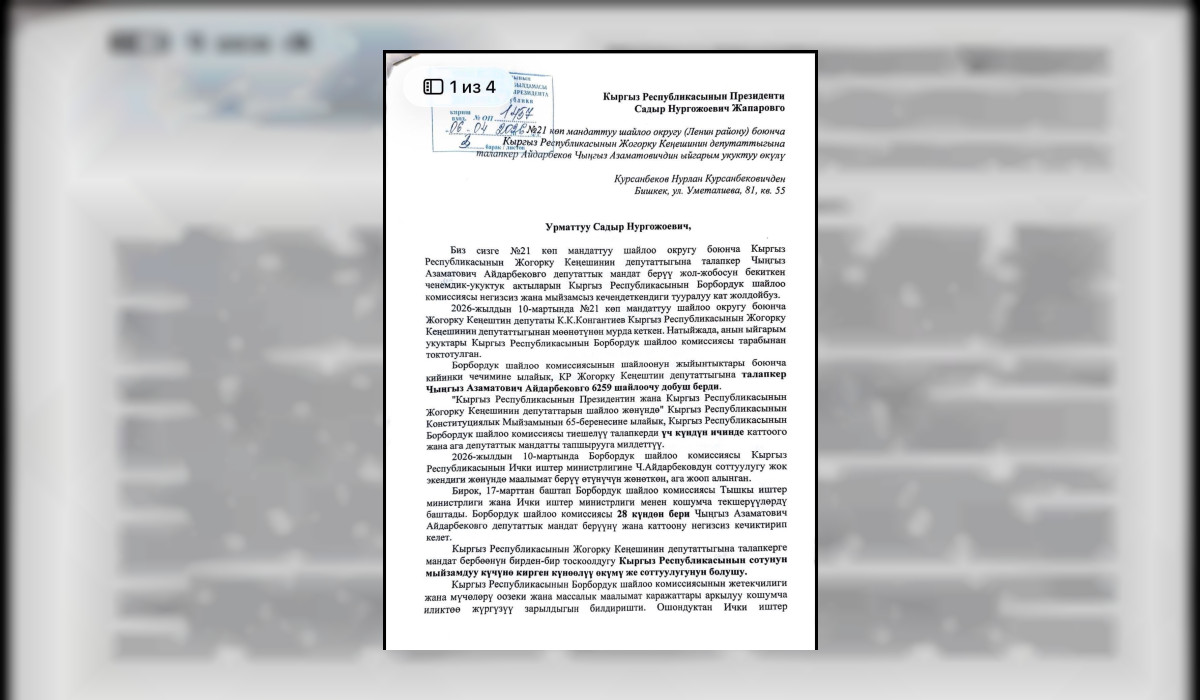 Жогорку Кеңештин мурдагы депутаты Чыңгыз Айдарбеков өлкө башчы Садыр Жапаровго кайрылды. Анын ыйгарым укуктуу өкүлү Нурлан Курсанбековдун атынан жазылган кайрылуу социалдык тармактарга тарады.