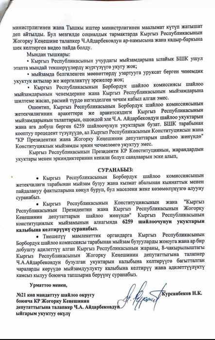 Анда БШК Айдарбековго мандат берүүнү негизсиз кечеңдетип жатканы айтылат. Кайрылууда БШКнын аракеттери Айдарбековдун жана ага добуш берген 6259 шайлоочунун укугун тебелеп жатат деген доомат коюлган. Ошондой эле президентке аталган маселени жеке көзөмөлүнө алуу суранычы жолдонгон.