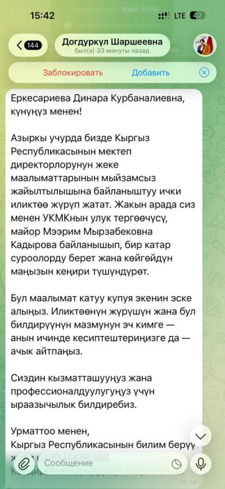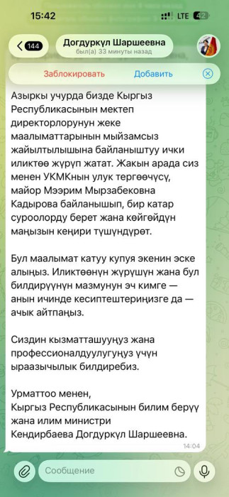 Агартуу министри Догдуркүл Кендирбаеванын атынан Telegram мессенжеринде билим берүү тармагында иштеген кызматкерлерге багытталган ар кандай билдирүүлөр тарап жатат. Бул тууралуу 8-апрелде аталган министрликтен маалымдашты.
