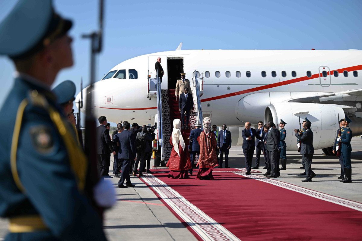 Аэропортто эки өлкөнүн мамлекеттик желектери илинип, ардактуу кароол тизилди.