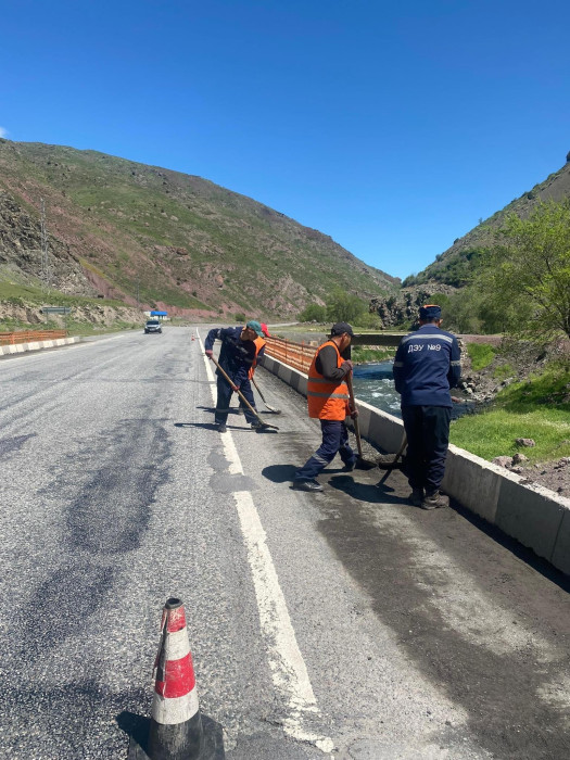 №47 ЖТИ: Тараз-Талас-Суусамыр унаа жолунда аң-чөнөктөрдү толтуруу, жол белгилерди жаңылоо, көпүрөлөр менен жол четиндеги тосмолорду актоо иштери жүрүүдө.
