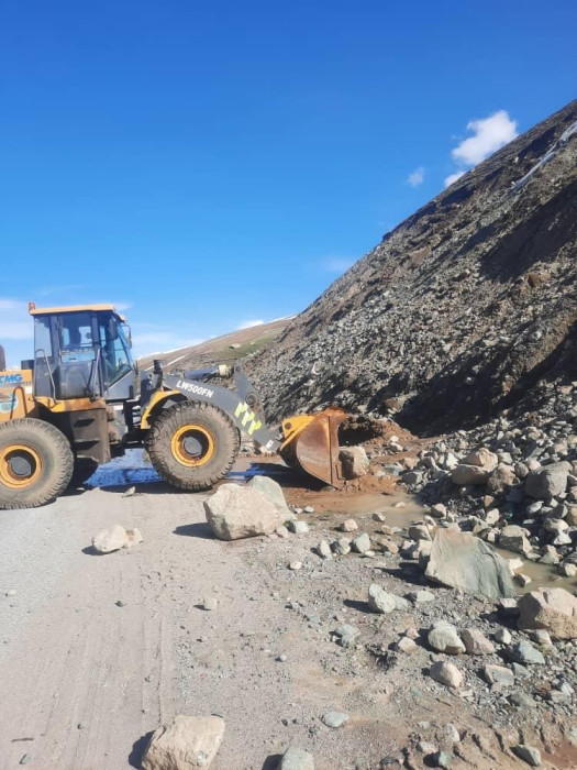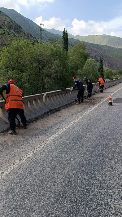 №9 ЖТИ: Бишкек-Ош унаа жолунун 155-чакырымында жаралган аң-чөнөктөр толтурулуп, 132-135 жана 206-209-чакырымдар аралыгында тоо боорунан түшкөн таштар тазаланды.