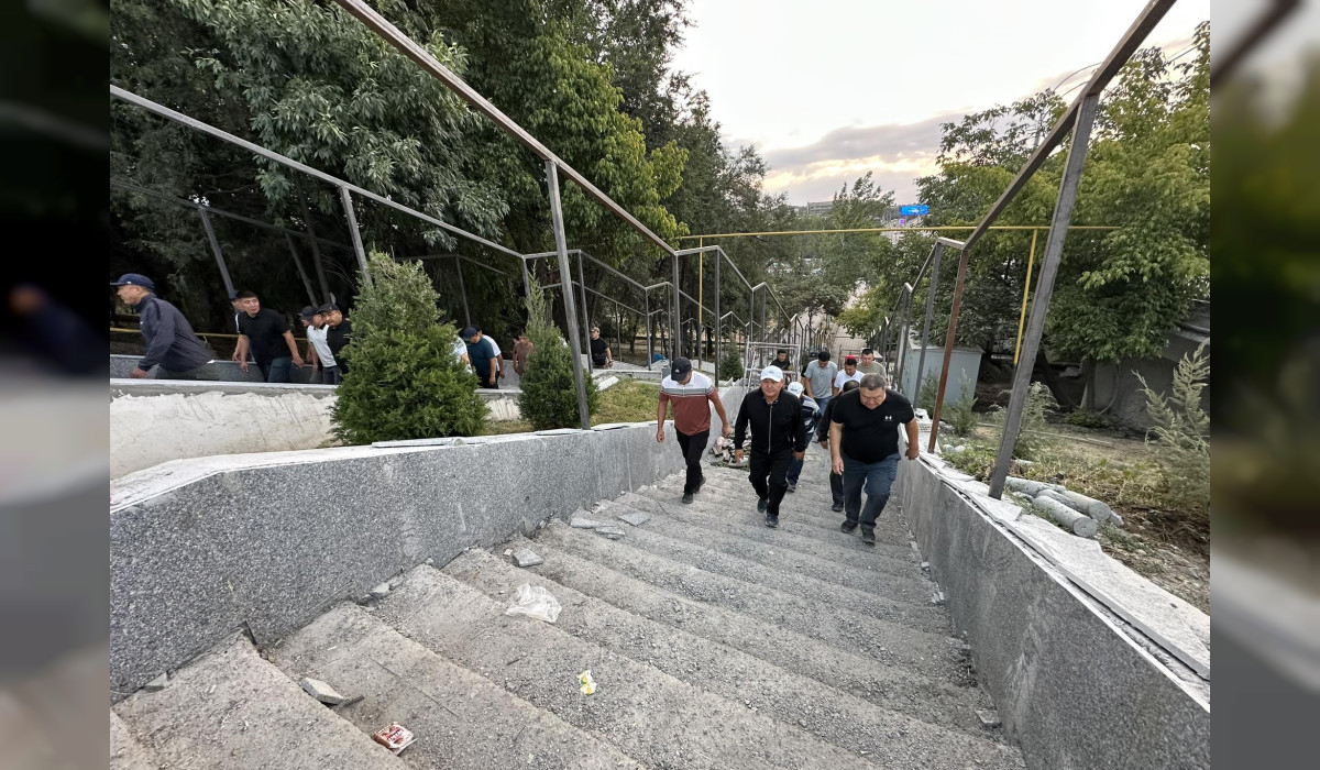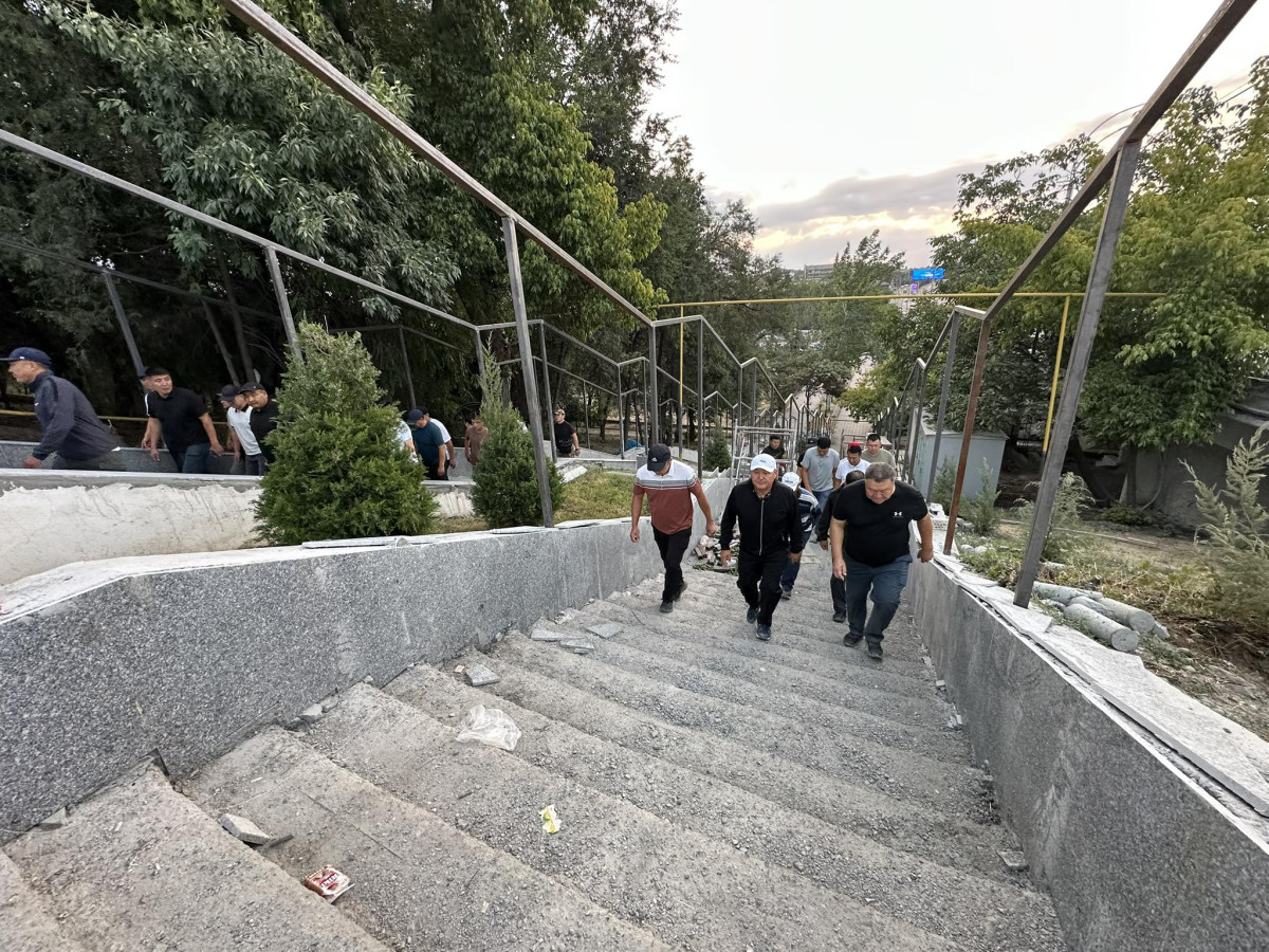 Аталган жердеги бузулган курулуш материалдарын тургундар менен бирге тазалап, тездетүү тапшырмасы берилди. Мындан тышкары, мрамор таштары менен калыбына келип жаткан тепкичтерди көрүп суктанды.