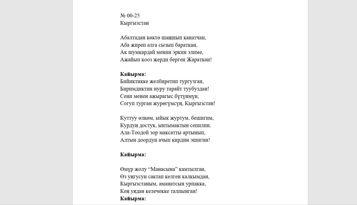 Айта кетсек, Маданият министрлиги 25-июлда мамлекеттик гимндин жаңы редакциясына текст тандоо боюнча түзүлгөн комиссия 5 тексттин долбоорун жактырганын билдирген. Эми тандалып алынган тексттерге музыкалык чыгарманы жаратуу боюнча кайрадан сынак жарыяланмакчы.