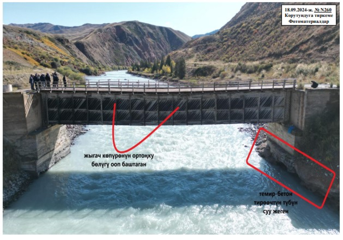 Министрлик ошондой эле жыгач көпүрө боюнча былтыр изилдөө иштери жүргүзүлүп, жараксыз абалда экени аныкталганын белгиледи. Натыйжада былтыркы жылдын 18-сентябрында тиешелүү тармактарга жаңы көпүрө куруу сунушу берилген.