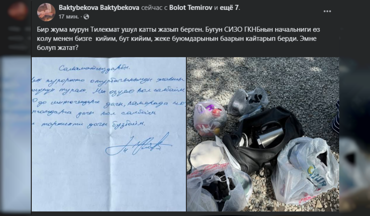 "Бир жума мурун Тилекмат ушул катты жазып берген. Бугун СИЗО УКМКнын башчысы өз колу менен бизге кийим, бут кийим, жеке буюмдарынын баарын кайтарып берди. Эмне болуп жатат?" - деди ал.