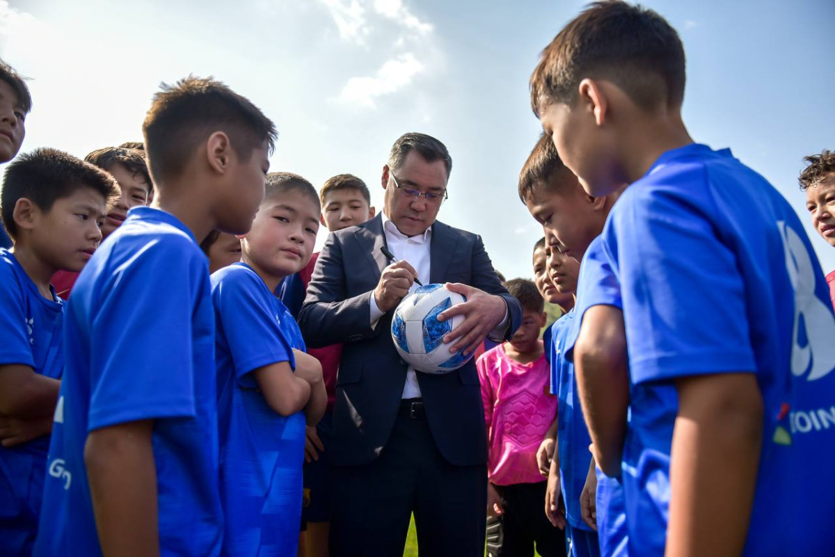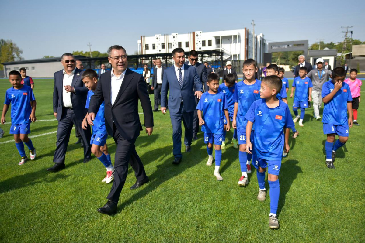 Мамлекет башчысы комплекстин шарттары менен таанышып, инфраструктураны көрүп чыкты жана жаш футболчулар менен бирге футбол талаасына чыгып, дарбазага топ киргизип, биргеликте эстеликке сүрөткө түштү.
