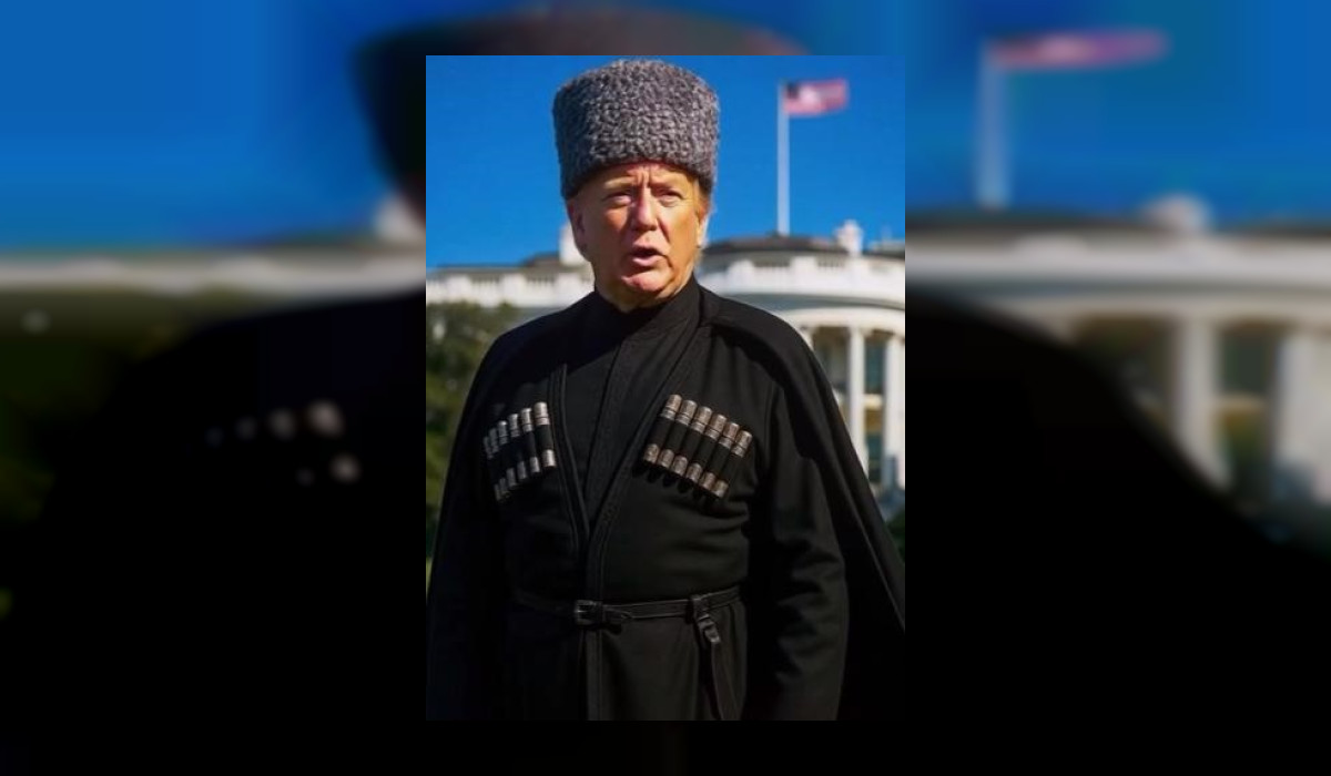 Видеодо Трамп чечен элинин улуттук кийимин кийип, АКШнын Ак үйүнүн алдында чеченче сүйлөп жатканын байкоого болот.