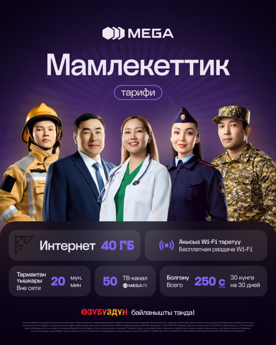 MEGA мамлекеттик уюлдук байланыш оператору өзгөчө сыймыктануу жана урматтоо менен: мугалимдер, дарыгерлер, ИИМдин, ӨКМдин кызматкерлери, аскер кызматчылары жана мамлекеттик мекемелердин бардык кызматкерлери үчүн уникалдуу «Мамлекеттик» тарифин сунуштайт.