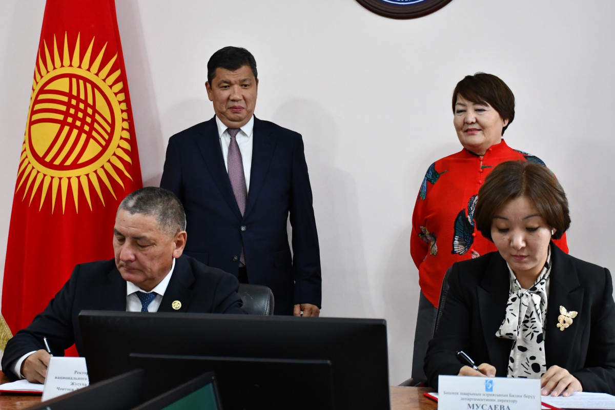 Бишкек шаарында Бишкек мэриясынын Билим берүү департаменти менен бир катар жогорку окуу жайлардын ортосунда кызматташуу жөнүндө макулдашууга кол коюлду. Иш-чарага агартуу министри Догдуркүл Кендирбаева, Бишкек шаарынын мэри Айбек Жунушалиев, вице-мэр Виктория Мозгачева, Бишкек шаарынын Билим берүү департаментинин директору Рахат Мусаева жана жогорку окуу жайлардын ректорлору катышты.
