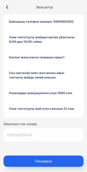 Колдонуучу "Эвакуация" бөлүмүнө кирип, унаасынын мамлекеттик номерин терет. Эгерде унаа эвакуацияланган болсо, тиркеме анын учурдагы жайгашкан жерин жана токтотулган атайын аянттын дарегин картадан көрсөтөт.