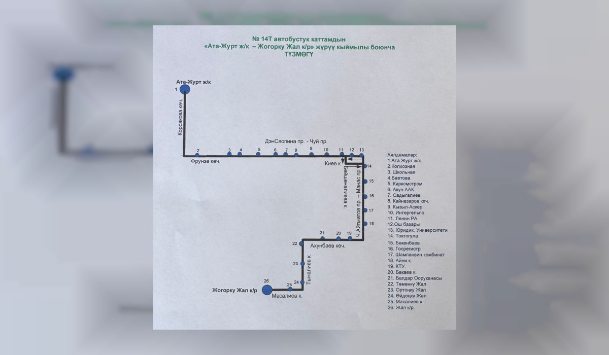 1-октябрдан тартып №14Т автобустук каттамдын кыймыл-чиймеси убактылуу өзгөртүлдү. Бул тууралуу шаардык мэриядан билдиришти.