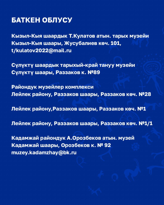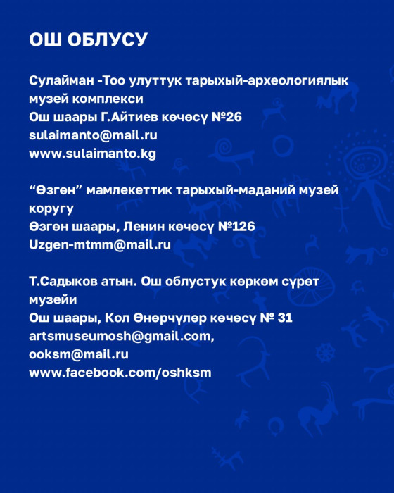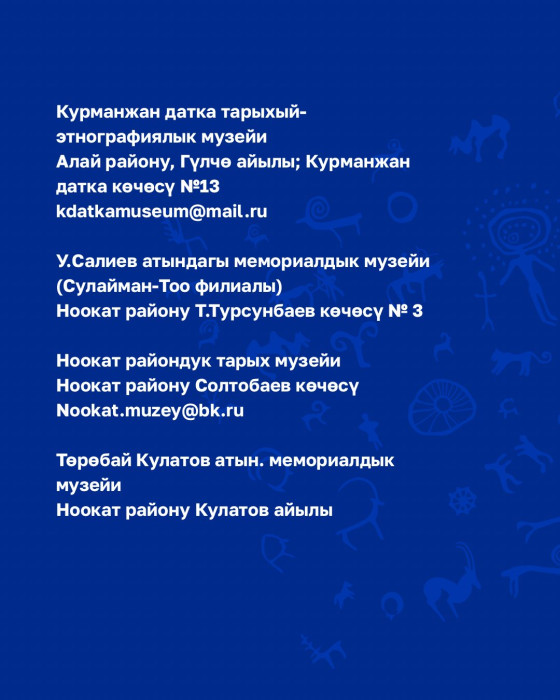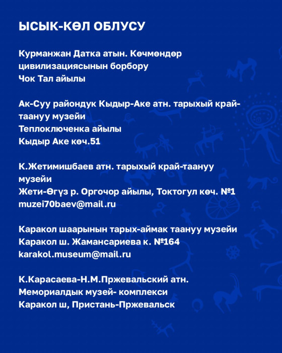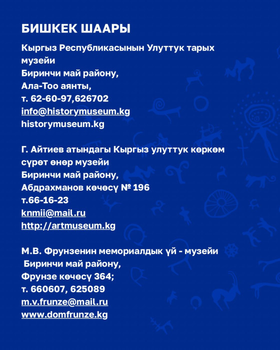 1-октябрдан 30-октябрга чейин Кыргызстандын мамлекеттик музейлеринде "Ачык эшиктер айы" жүргүзүлөт. Бул тууралуу Маданият министрлиги билдирди.