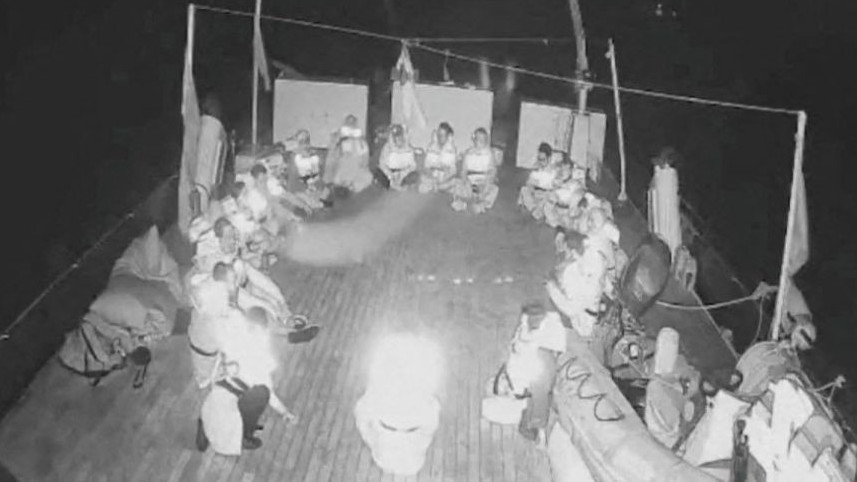 Израилдин ТИМи жарыялаган жана Reuters тастыктаган видеодо Грета Тунберг аскерлердин курчоосунда палубада отурганы көрүнөт.