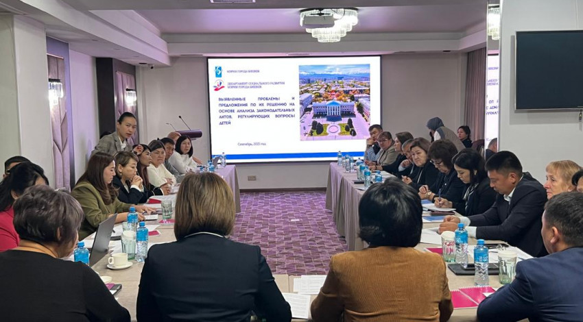 Бишкек шаарынын мэриясынын социалдык өнүктүрүү департаменти тарабынан балдардын укуктарын жана кызыкчылыктарын коргоо маселелерин жөнгө салуучу колдонуудагы мыйзам актыларын талдоонун негизинде аныкталган көйгөйлөр жана аларды чечүү боюнча сунуштар чагылдырылган презентация көрсөтүлдү.