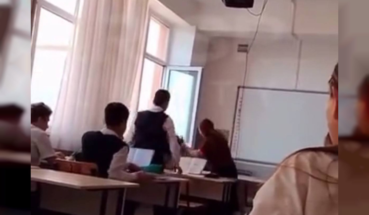 Социалдык тармактарда Алматыдагы мектептердин биринде тартылган видео тараган. Видеодо мугалим окуучуларды урганы көрүнөт.