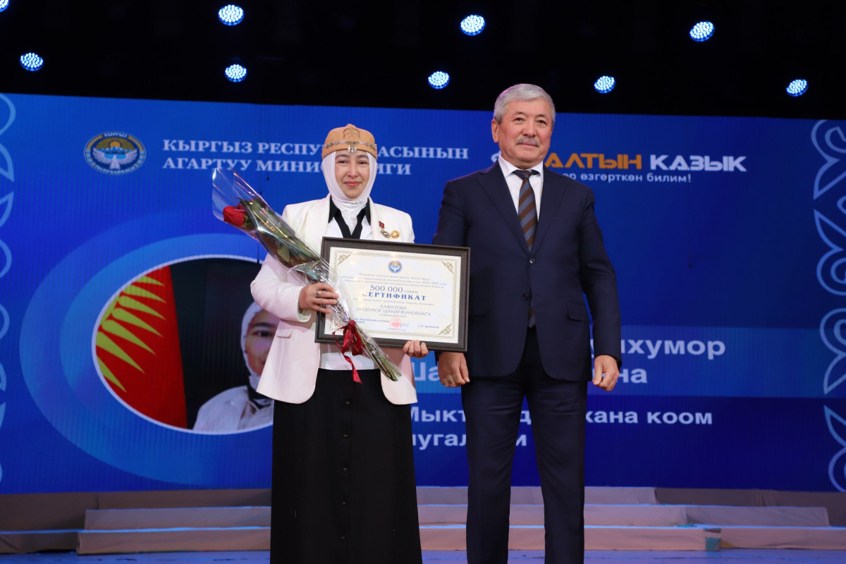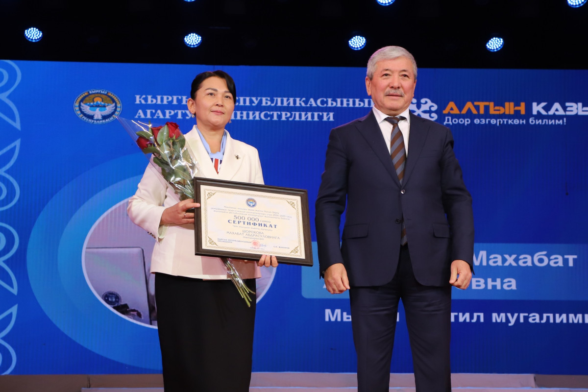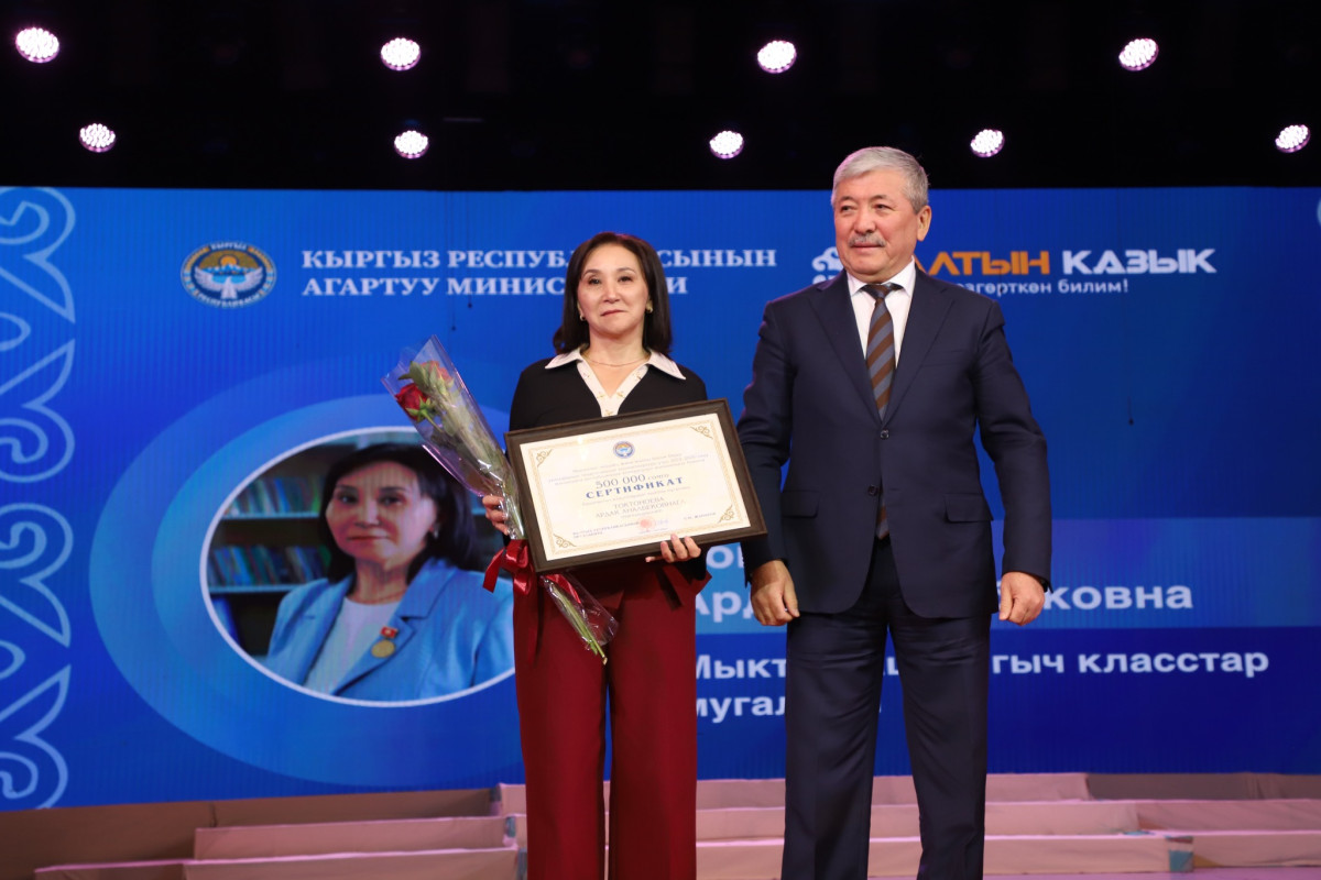 Ошондой эле республикалык сынакта ар бир предмет боюнча жеңүүчү аталган 10 мугалимге президенттин фондунан 500 миң сомдон акчалай сыйлык тапшырды.