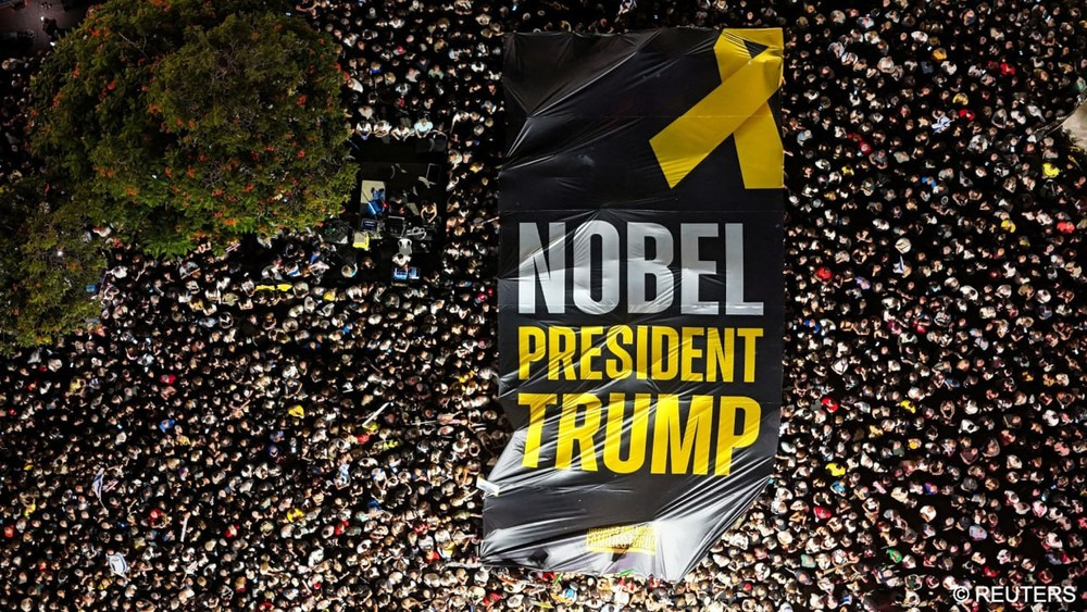 Демонстранттар "Рахмат, Трамп!" деп кыйкырып, аны "Нобель" тынчтык сыйлыгына көрсөтүүнү талап кылышты.