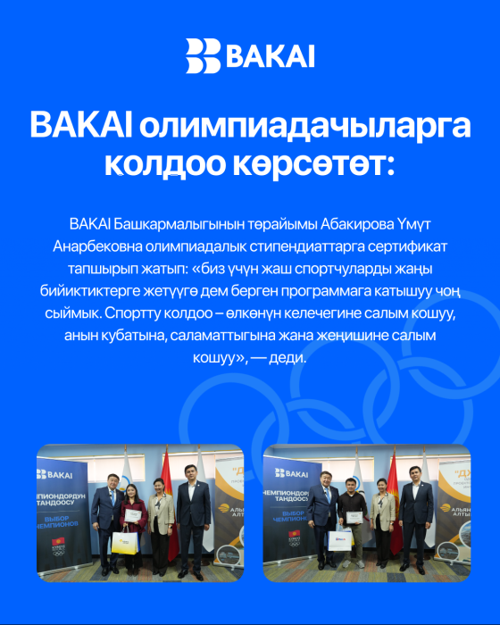 BAKAI Башкармалыгынын төрайымы Абакирова Үмүт Анарбековна олимпиадалык стипендиаттарга сертификат тапшырып жатып: «биз үчүн жаш спортчуларды жаңы бийиктиктерге жетүүгө дем берген программага катышуу чоң сыймык. Спортту колдоо – өлкөнүн келечегине салым кошуу, анын кубатына, саламаттыгына жана жеңишине салым кошуу», — деди.