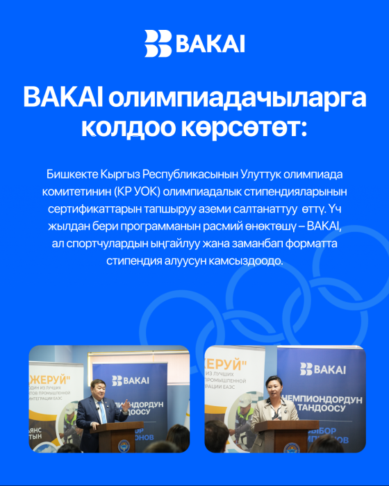 Бишкекте Кыргыз Республикасынын Улуттук олимпиада комитетинин (КР УОК) олимпиадалык стипендияларынын сертификаттарын тапшыруу аземи салтанаттуу өттү. Үч жылдан бери программанын расмий өнөктөшү – BAKAI, ал спортчулардын ыңгайлуу жана заманбап форматта стипендия алуусун камсыздоодо.