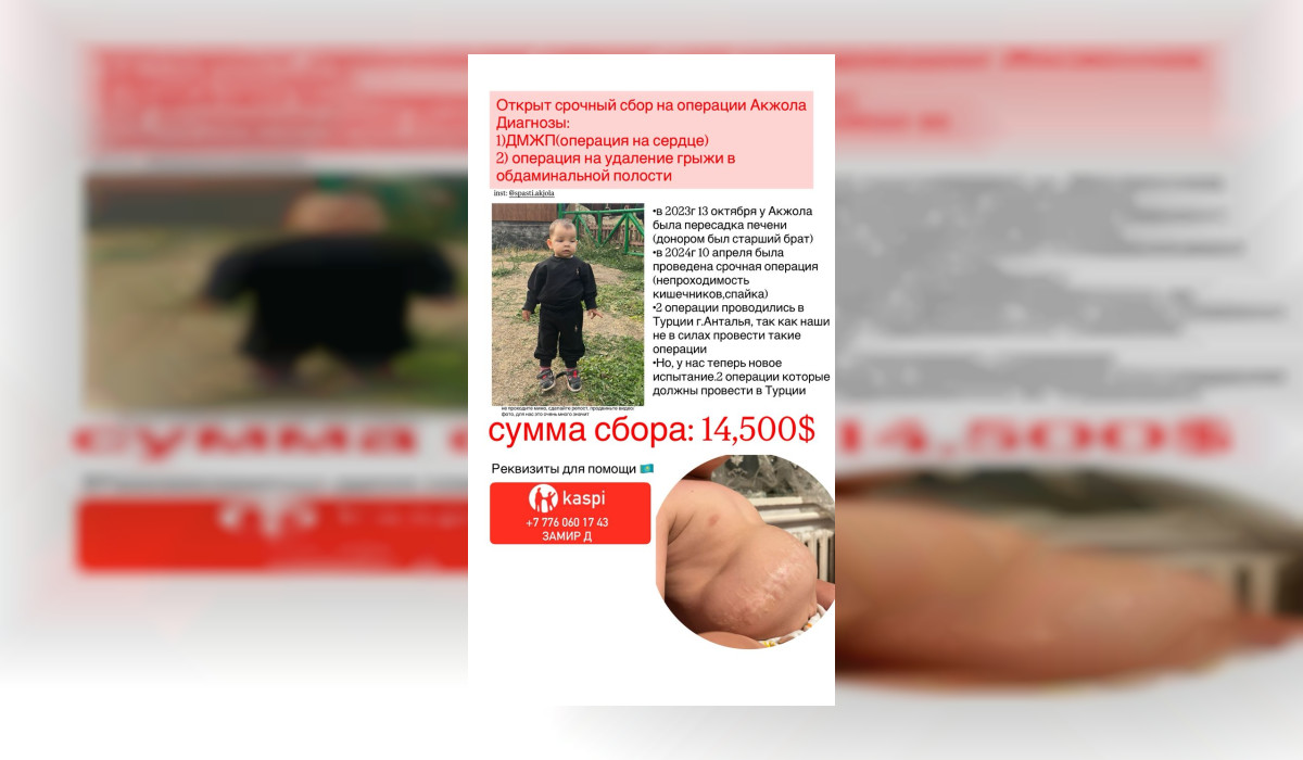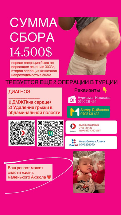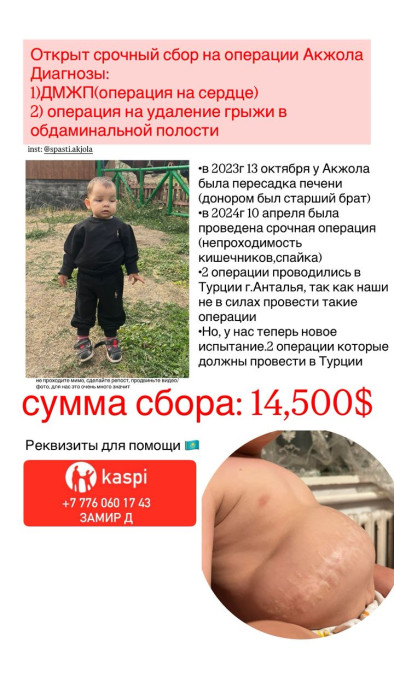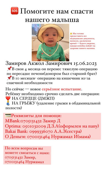 Эки жаштагы Акжол тез арада операция жасатууга муктаж. Буга чейин наристеге эки чоң операция жасалган, тилекке каршы, ага дагы операция жасатуу зарылчылыгы болууда. Акжолдун ата-энеси тиешелүү каражатты топтой албай жаткандыктан коомчулуктан жардам суроого аргасыз.